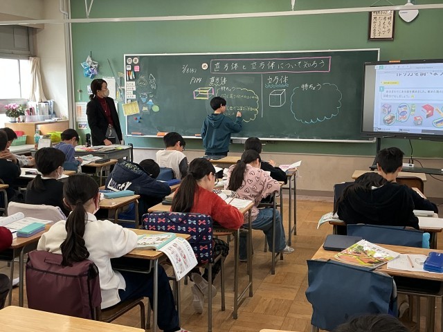3年生の算数の学習の様子です。今日は「直方体と立方体」の学習をしました。形の定義や面や辺、頂点などの数について、実際に箱にさわって調べたり、大型提示装置に映して数えたりしながら、学習を進めていました。
