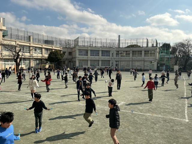 今週と来週は「なわとびweek」です。これは、令和7年度の体力調査で、本校の課題であると考えられる点について、向上を目指していくための取組として設定しています。中休みの前半を「なわとびタイム」として、1〜3年生と4〜6年生に分けて実施します。初日の今日は、4〜6年生が行いました。