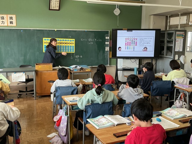 3年生の算数の学習の様子です。今日は「そろばん」の学習をしました。教科書にも載っているそろばんの学習ですが、子どもたちには少し馴染みの薄いものかもしれません。しかしながら、子どもたちの中には、そろばんを習っている子もいて、教え合ったりしながら、学習を進めていました。