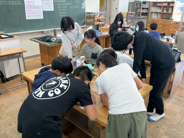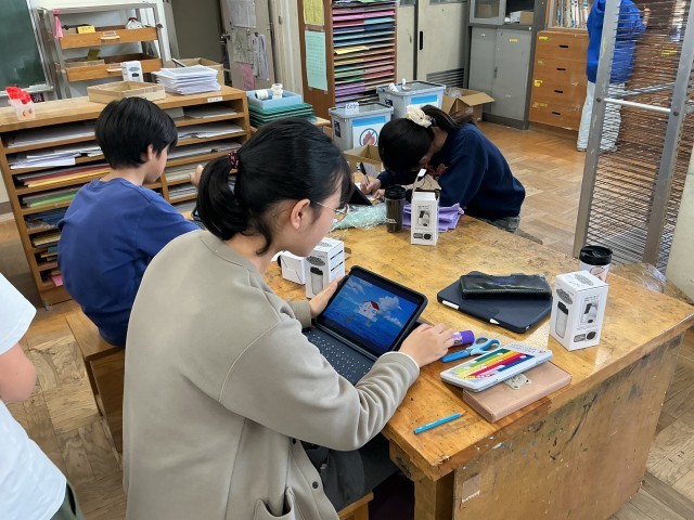 6年生の図工の学習の様子です。6年生は今、卒業記念品として「12歳のお気に入りタンブラー」を製作しています。自分でいろいろと調べたり、友達と相談し合ったりしながら、楽しく製作を進めています。個性的な作品になりそうで、完成が楽しみです。