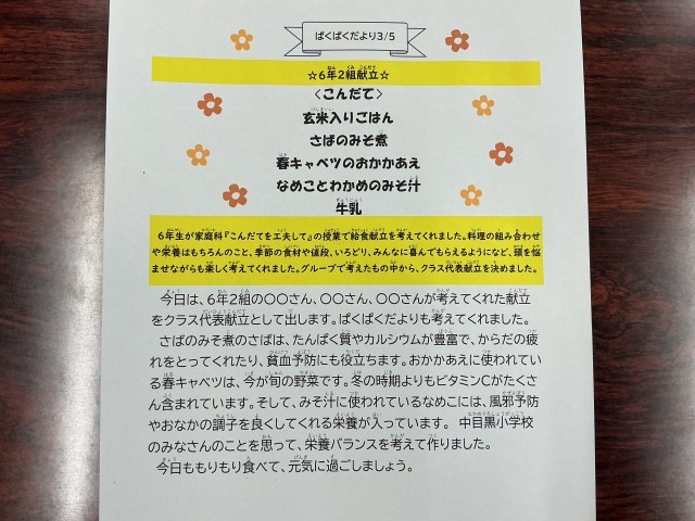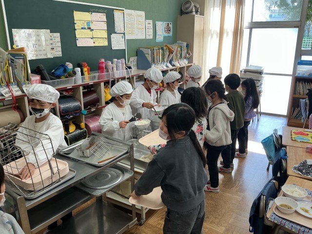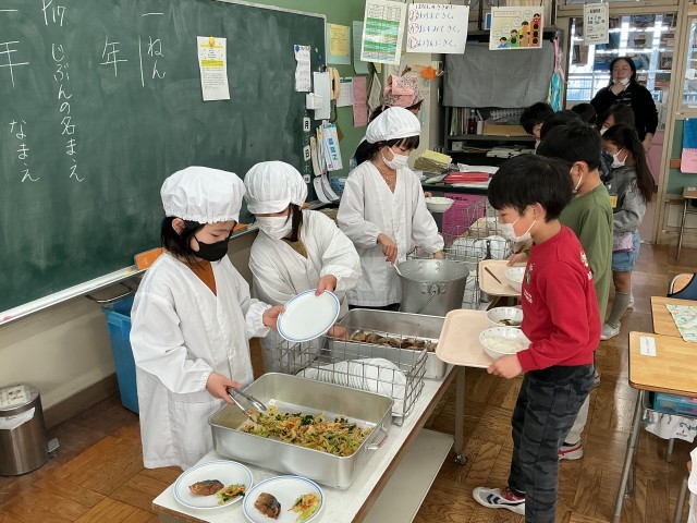3/5(木)は「6年2組献立」でしたが、今日は「6年3組献立」です。前回も紹介したように、6年生が家庭科の時間に、いろいろと考えて決めた献立を、給食で提供したものです。給食準備をしているのは、2年生です。手際よく配膳していました。