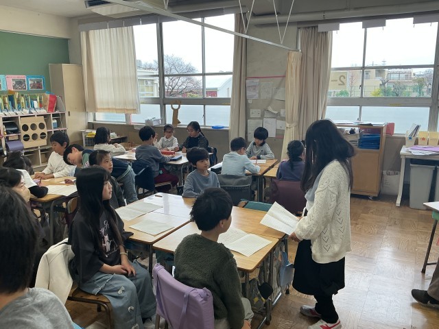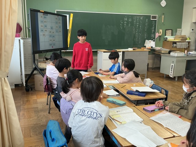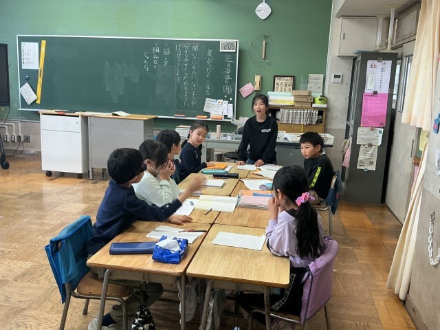 2年生の国語の学習の様子です。今日は「たのしかったよ 2年生」の学習の一環として、自分が作った文章を、班の中で発表し合いました。聞いている人に分かりやすく伝わるよう、話し方や文章の組立などに気を付けながら、発表し合いました。質問や感想なども述べることもできました。