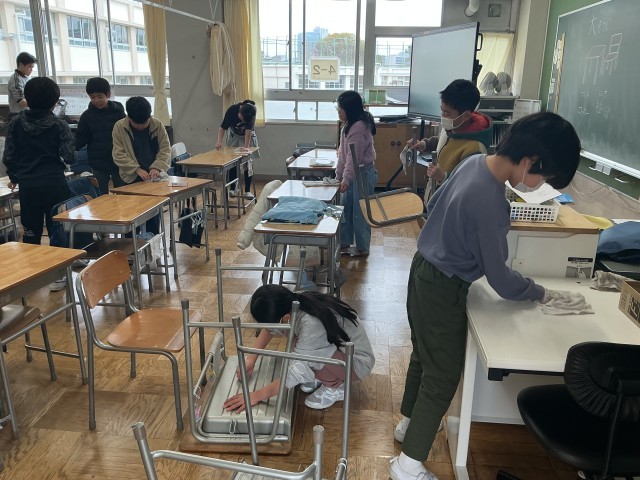 学年末を迎え、多くの学年、学級では、大掃除を行いました。写真は4年生の大掃除の様子です。1年間、自分たちが使用した教室などの、いつもは掃除をしないような所も、今日は念入りに掃除をしている姿が見られました。4月からは次の学年が使用します。しっかりと掃除をすることができました。