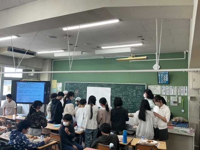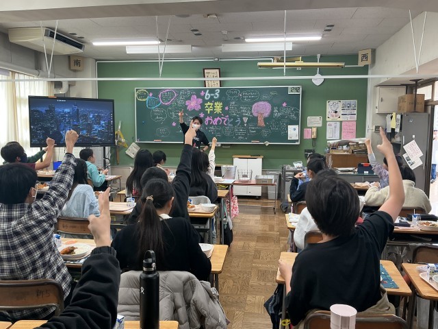 今日は、今年度最後の給食でした。献立は、「カツカレーライス」「レモンサラダ」「みかんシャーベット」「牛乳」でした。6年生にとっては、進学先によっては、最後の給食になるかもしれません。少なくとも、6年生全員にとって、小学校生活最後の給食でした。今日も、いつも通り、「おかわりじゃんけん」で盛り上がっていました!