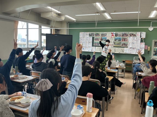 これまで6年1組から3組まで紹介してきましたが、今日は「6年4組献立」です。ピラフや紅白コロッケ、ABCスープ、果物など、組み合わせなどを考えながら組み立てた献立です。6年生にとっては、小学校での給食は、残り2回となりました。最後まで美味しくいただきましょう。給食準備をしているのは、4年生です。