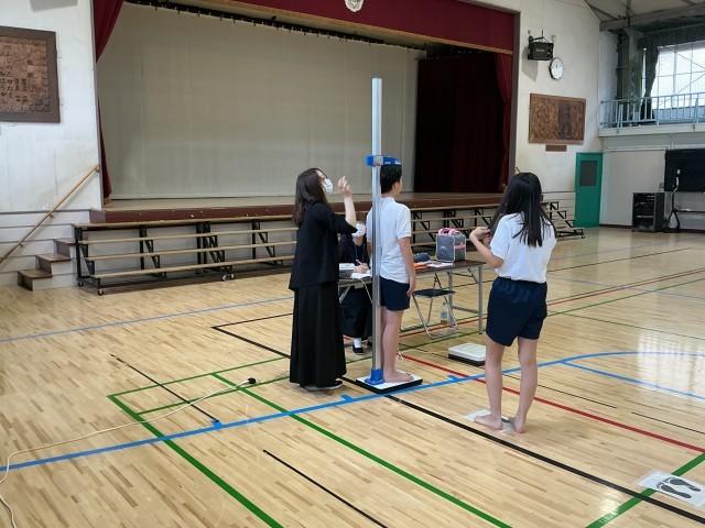 朝の健康指導を受けて、今日から定期健康診断が始まりました。今日は、3年生と5年生が、発育測定(身長・体重)と視力検査、聴力検査を行いました。指示をしっかりと聞きながら、測定や検査を受けている様子でした。