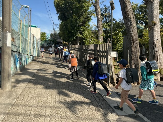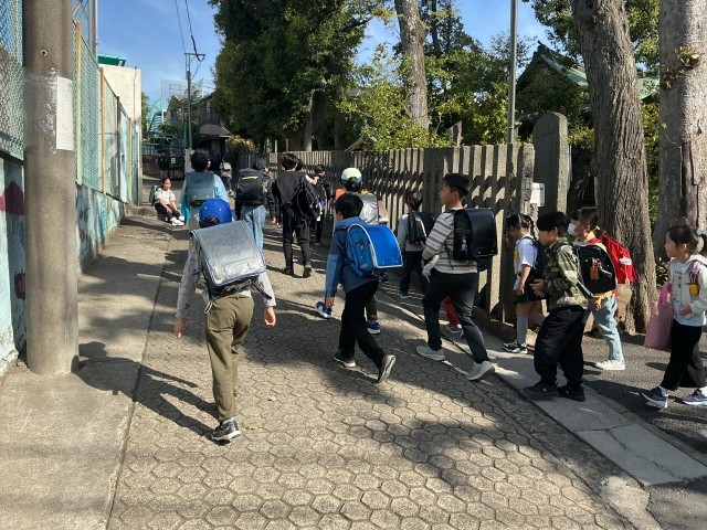 本校では、毎年度当初は、保護者の皆様等にもご協力いただきながら、校外班での集団登校を行っています。今年度は5/8(金)まで実施いたします。このことで、新学期の生活リズムの確立や安全面の確保、異学年の関わりの機会設定による思いやりの心の育成、有事の際の備え等に役立てています。高学年がしっかりと低学年のお世話をしています。