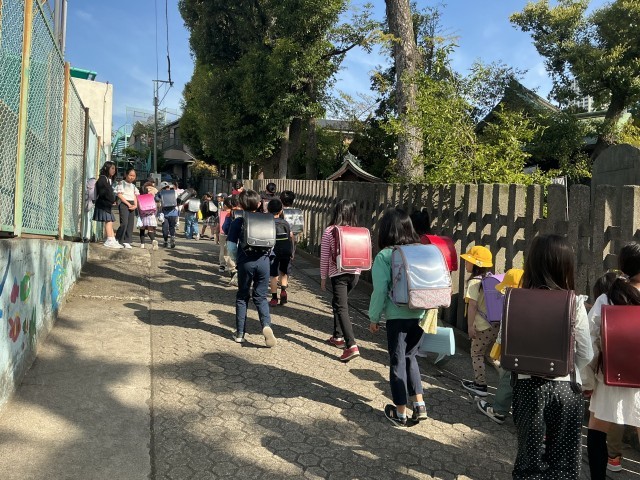 1年生の下校時の様子です。学童保育クラブや児童館も含め、帰る場所やコースなどを確認してから下校します。子どもたちができるだけ安全に安心して下校できるようにしています。最後は本校定番の「さようなら!グッバイ!」でジャンケンをして下校していきます。