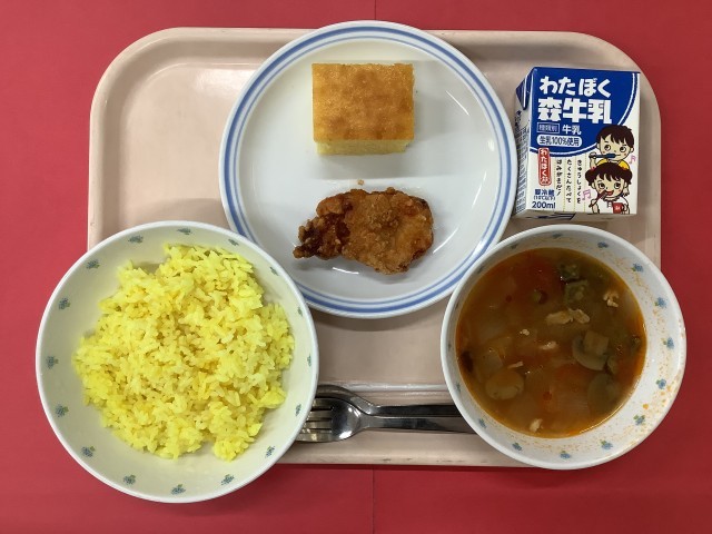 鶏肉(国産) ひよこ豆(アメリカ) シュレッドチーズ(北海道) ベーコン(千葉、群馬) 豆乳(国産) 大豆(北海道) じゃがいも(北海道) にんにく(青森) にんじん(北海道) 玉ねぎ(北海道) マッシュルーム(山形) 小松菜(茨城) 早生みかん(愛媛)