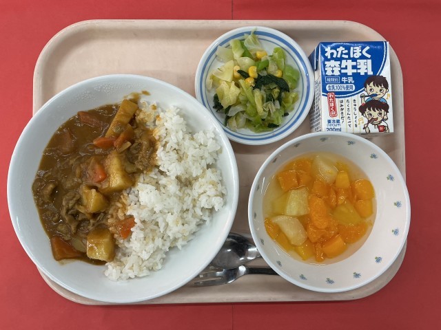 豚肉(茨城) いんげん豆ペースト(国産) 精白米(秋田) 玄米(秋田) じゃがいも(長崎) 玉ねぎ(北海道) にんじん(青森) 生姜(高知) セロリー(静岡) にんじん(千葉) キャベツ(千葉) とうもろこし(北海道) 小松菜(茨城) みかん(スペイン) 白桃(山形) 黄桃(外国産) パイン(外国産)