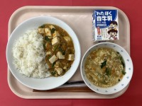 牛乳マーボー豆腐丼かきたま汁<主な食材の産地>鶏肉(国産) 木綿豆腐(大豆:愛知、佐賀) 鶏肉(国産) 卵(青森) 精白米(秋田) 玄米(秋田) 生姜(高知) にんにく(青森) にんじん(...