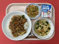 牛乳回鍋肉丼にら玉スープ切り干し大根のごま酢あえ<主な食材の産地>豚肉(茨城) 木綿豆腐(大豆:愛知、佐賀) 卵(青森) 精白米(秋田) 玄米(秋田) にんにく(青森) 生姜(高知) 玉ねぎ(北海道)...