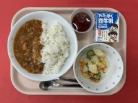 牛乳米粉のポークハヤシライスチーズ入りポテトフレンチサラダ紅茶ゼリー<主な食材の産地>ベーコン(千葉、群馬) 豚肉(茨城) いんげん豆ペースト(国産) 精白米(秋田) 玄米(秋田) じゃがいも(北海道...