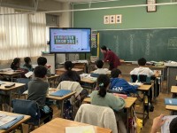 3年生の外国語活動の学習の様子です。3年生は外国語の講師の先生を中心に、アクティビティも取り入れながら、楽しく学習しています。今日は形の名称や動物の名前などを、クイズも入れながら学んでいました。