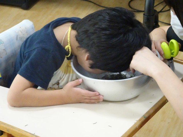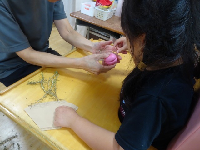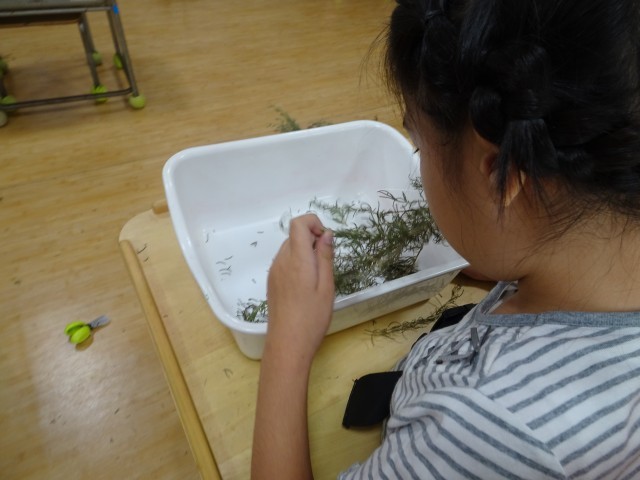 中庭のローズマリーを収穫し、サシェ(匂い袋)作りをしました。乾いてパリパリした葉っぱを握ったり、カスタネットバサミを使って切ったりして素材と関わりました。