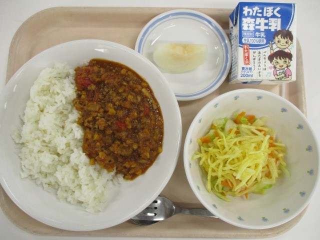 9月26日 レンズ豆のキーマカレー・じゃがいものハニーサラダ・果物(なし)・牛乳