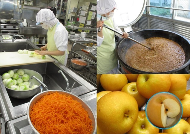 レンズ豆のとろみも加わったキーマカレーです。じゃがいものハニーサラダは、はちみつドレッシングのサラダに、せん切りのカリカリポテトをトッピングしています。梨は「南水」という種類で、酸味は少なく甘い梨でした。どれも人気でおかわりにたくさん手が挙がっていました。