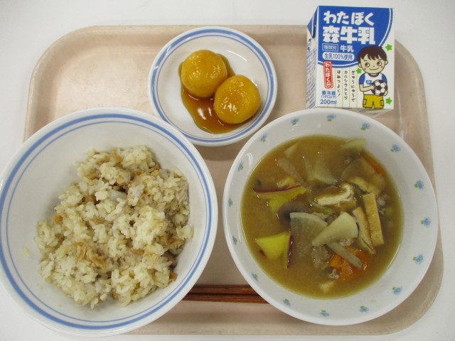 10月3日 里芋と鶏のごはん・秋の豚汁・かぼちゃの月見団子・牛乳