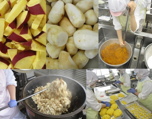 10月6日(月)は十五夜です。里芋を指す「いも名月」とも呼ばれます。里芋を炊き込んだご飯に、さつまいも、しめじ、大豆など秋の食材の豚汁、お団子を作りました。お団子はかぼちゃを練り込み、蒸してみたらしをかけています。モチモチとやわらかいお団子に仕上がりました。