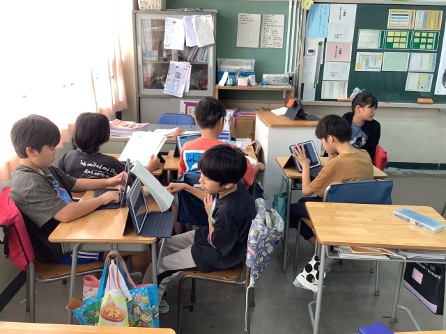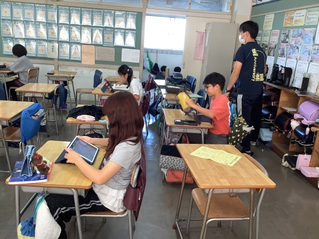 5年生は、国語の「たずねびと」の学習をしていました。単元内において、自分のペースや方法で学習に取り組むスタイルを取り入れていました。友達と意見交換しながら学習する、一人でじっくり学習するなど、思い思いに集中して取り組む様子が見られました。