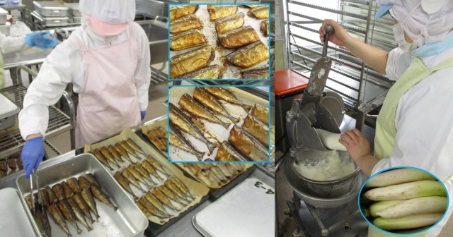 大根(北海道)・キャベツ(群馬)・人参(北海道)・玉ねぎ(北海道)・長ねぎ(秋田)・ひよこ豆(アメリカ)・油揚げ(愛知・佐賀)・さんま(北海道)