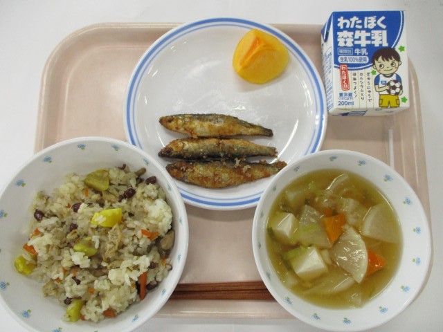 10月16日 蒜山(ひるぜん)おこわ・スプラットのから揚げ・大根のそぼろ汁・果物(かき)・牛乳