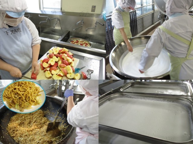 岡山県の蒜山地域で生まれた焼きそばです。りんご、玉ねぎ、にんにくなどをすりおろしてみそダレを作り、鶏肉とキャベツの焼きそばにしました。蒜山焼きそばが生まれた理由のクイズを交えて、給食委員が紹介しました。