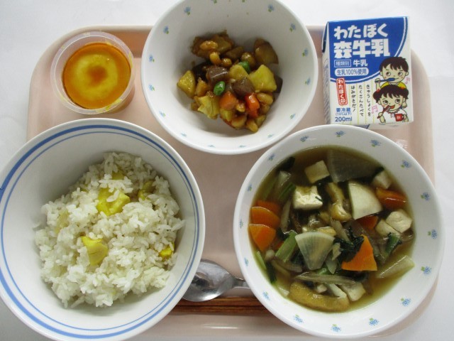 10月31日 栗ご飯・変わり五目豆・けんちん汁・かぼちゃプリン・牛乳