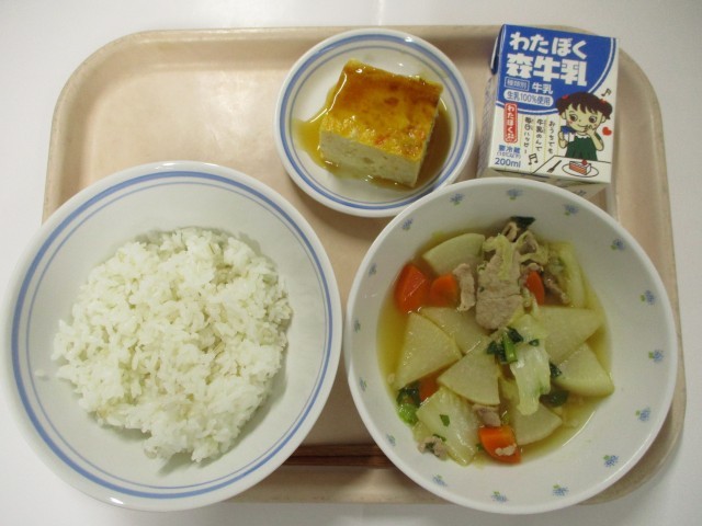 12月10日 ご飯・ぎせい豆腐 甘酢あん・大蔵大根と豚肉の煮物・牛乳