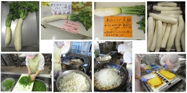 大蔵大根は、世田谷区の伝統野菜です。今日は、世田谷区産の新鮮な大蔵大根を葉も一緒に煮物にしました。煮物やおでんに最適と言われている大蔵大根なので、煮汁が染み込んでやわらかくジューシーな大根でした。世田谷区の農家さんから、大蔵大根と青首大根の違いがわかるようにと、実物を見本にいただいたので展示しました。