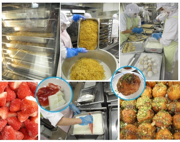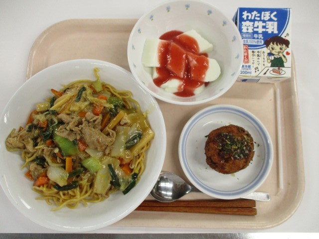開校100周年記念フェスタの前日です。フェスタ(お祭り)をイメージして、焼きそば、たこ焼きです。たこ焼きポテトは、じゃがいもをつぶして、たこや粉かつお、ねぎなどを混ぜて丸めて揚げています。紅白ゼリーは、ミルクゼリーに甘酸っぱいいちごソースを教室でかけて食べます。いちごは静岡県産の冷凍いちごをミキサーにかけてソースにしました。