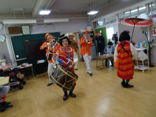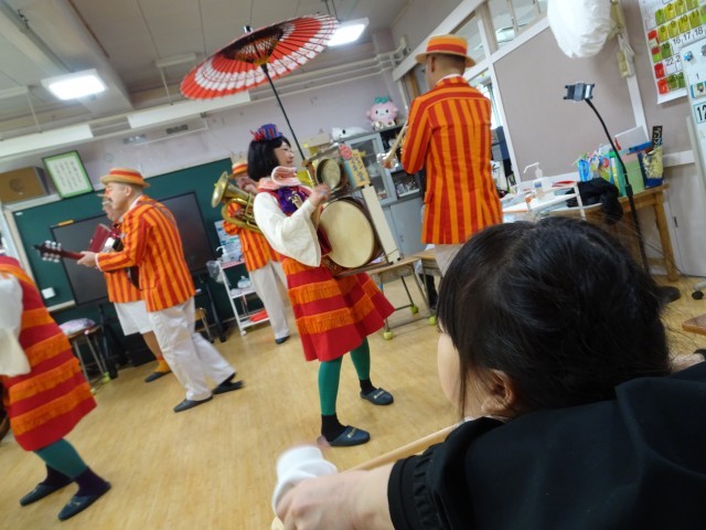 わかたけ学級の教室にもちんどんパレードが来てくれました。じっくり見て楽しい雰囲気を味わい、お祝いの気持ちを高めました。