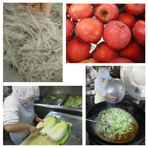 キムチ(国産)・生姜(高知)・ニンニク(青森)・人参(茨城)・小松菜(東京)・玉ねぎ(北海道)・白菜(茨城)・長ねぎ(新潟)・ニラ(高知)・りんご(長野)・筍(九州・四国)・豚肉(九州)