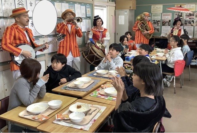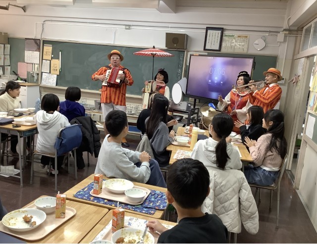 フェスタ2日目の給食時に、サプライズでジュンマキ堂さんが各廊下、教室をまわってくださいました。子どもたちのうれしそうな表情、ジュンマキ堂さんの声かけに元気に答える様子が印象的でした。