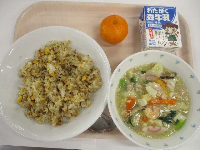 12月19日 じゃこチャーハン・ガタタン(あんかけスープ)・果物(みかん)・牛乳