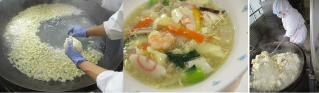 生姜(高知)・長ねぎ(栃木)・人参(千葉)・白菜(茨城)・小松菜(埼玉)・ちりめんじゃこ(広島)・イカ(ペルー)・海老(インドネシア)・鶏卵(秋田)・豚肉(九州)・みかん(長崎)