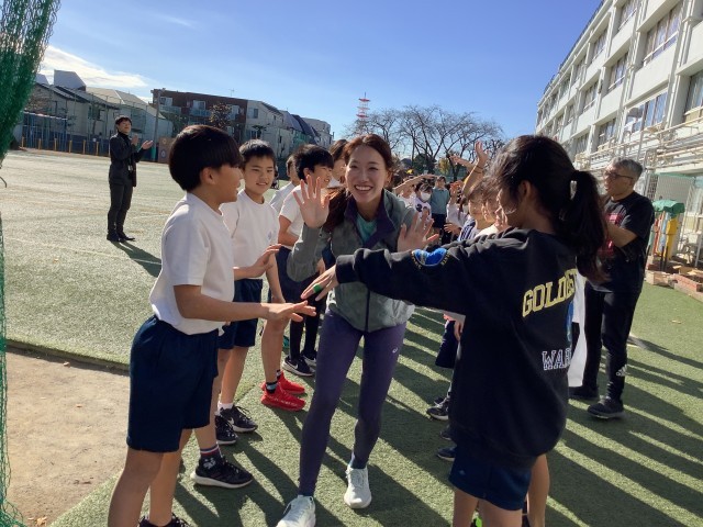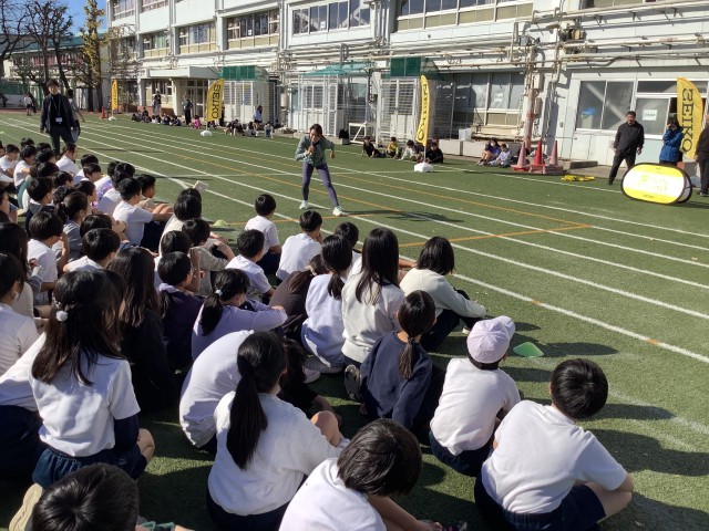 東京都の事業である「笑顔と学びの体験活動プロジェクト」として、福島千里さん(女子100m日本記録保持者、オリンピアン)をお招きし、全校児童対象の講演会と5、6年生との体験交流会を実施しました。