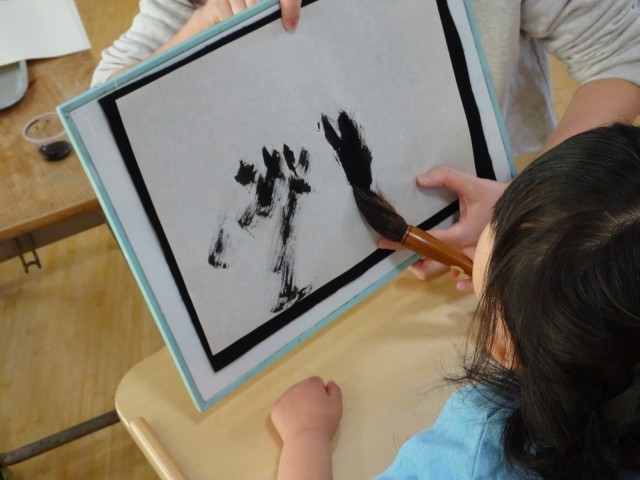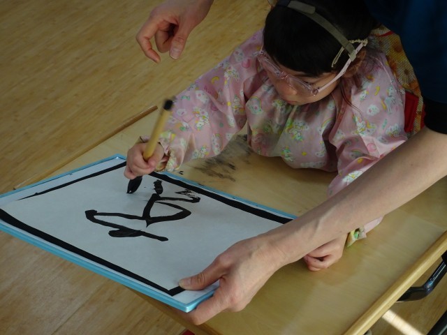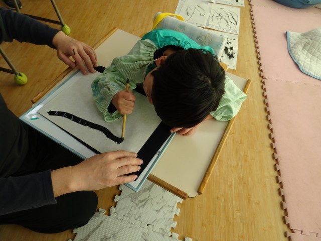 書き初めでは、筆を使って様々な点や線を自由に書きました。だるま筆や太筆、細筆、指筆の中から自分の好みの筆を選んでいます。