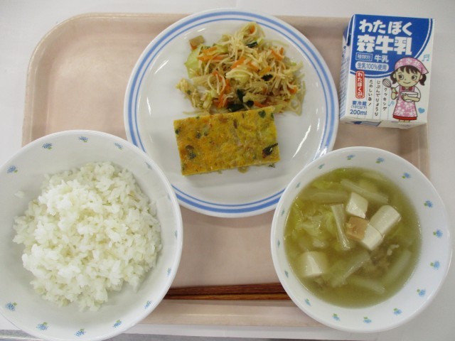 1月22日 ご飯・切り干し大根の卵焼き・焼きビーフン・白菜と豆腐のスープ・牛乳