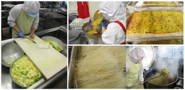 台湾の料理です。切り干し大根入りの卵焼きや焼きビーフン、白菜のスープなど、台湾でよく食べられている料理です。スープは鶏ガラと干し貝柱で出汁をとったので、うま味たっぷりで「おいしかった!」という声をたくさんもらいました。