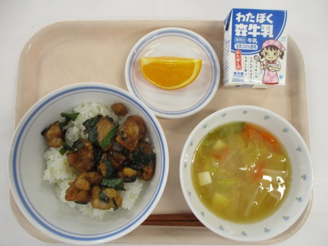1月28日 トリニータ丼(大分県)・みそ汁・果物(かんきつ)・牛乳