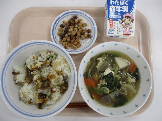 2月3日 いわしの蒲焼きご飯・けんちん汁・2色福豆(きなこ、ココア)・牛乳