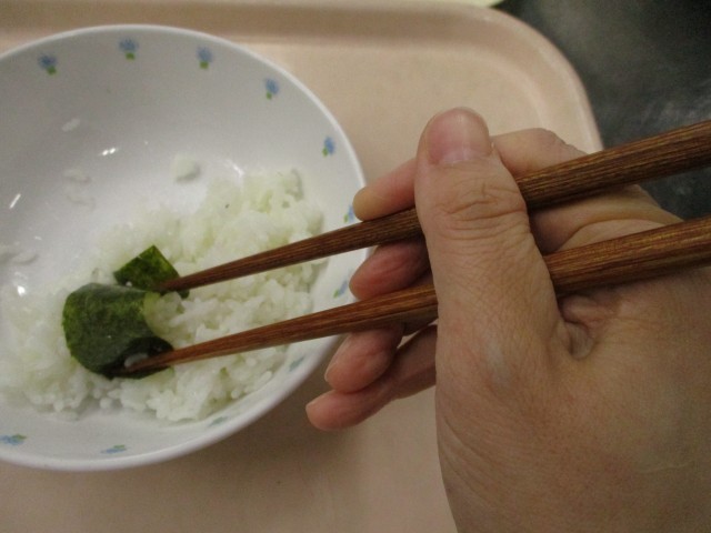 正しい箸の持ち方について写真を見せながら話しました。正しい箸の持ち方だと、焼き海苔でご飯をくるんで食べられます。低学年になるほど難しい子が多かったですが、上手に箸でくるんで食べられる子もたくさんいました。どの学年でも、箸の持ち方が上手な子は「見て!できるよ!」ときれいな箸使いを見せてくれました。
