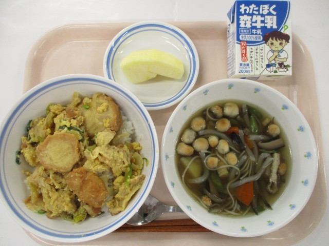 3月11日 油麩丼・おくずかけ・果物(りんご)・牛乳