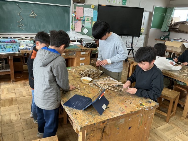 5年生は、図工の時間に「おはしで大変身!」の活動中でした。輪ゴムを使ってつなげたり、積み重ねたりして、楽しく取り組んでいました。