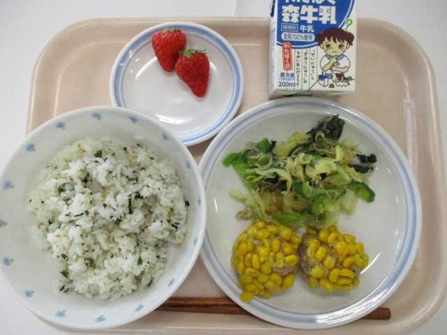 4月8日 わかめご飯・肉団子のコーン蒸し・じゃこサラダ・果物(いちご)・牛乳