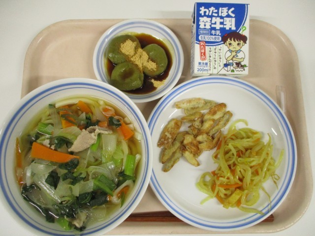 4月10日 ごぼう天うどん・もやしのカレー風味・よもぎだんご(黒みつきなこ)・牛乳