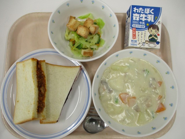 4月20日 2色サンド(ミートソース・ジャム)・クリームシチュー・カリカリパンのサラダ・牛乳