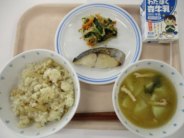 4月21日 たけのこご飯・魚の塩麹焼き・野菜のごま和え・みそ汁・牛乳