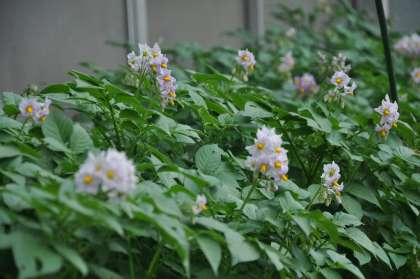 6年生が育てているジャガイモに次々に花が咲いています。